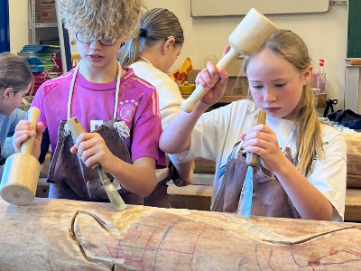 Beim zweiten Termin ging es dann richtig zur Sache: In der Künstlerwerkstatt wurden vorab die Entwürfe auf zwei Meter lange Holzstämme übertragen, bevor nun die Zehn- bis Vierzehnjährigen ihre mit professionellem Werkzeug zur Holzbearbeitung an ihren eigenen Kunstwerken arbeiten durften. Einige konnten ihre Stehlen sogar schon mit Farbe versehen.